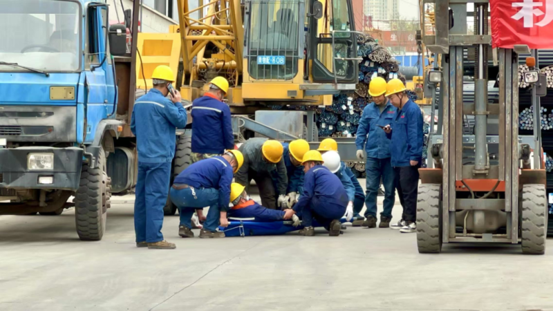 本次演練模擬鋼板區(qū)在進行吊裝作業(yè)時突發(fā)輪胎起重機吊裝貨物擺幅過大傷人事故。演練前期,制定了詳細方案并組織培訓,籌備救援、醫(yī)療等物資,布置模擬場景。演練啟動后,通訊聯(lián)絡(luò)組迅速傳遞事故信息,現(xiàn)場指揮組即刻啟動應(yīng)急響應(yīng)。警戒疏散組快速隔離現(xiàn)場、疏散人員;應(yīng)急救援組解救受傷人員、排除設(shè)備故障;醫(yī)療救護組對傷員緊急救治并送醫(yī);后勤保障組及時供應(yīng)物資,各環(huán)節(jié)有序推進。